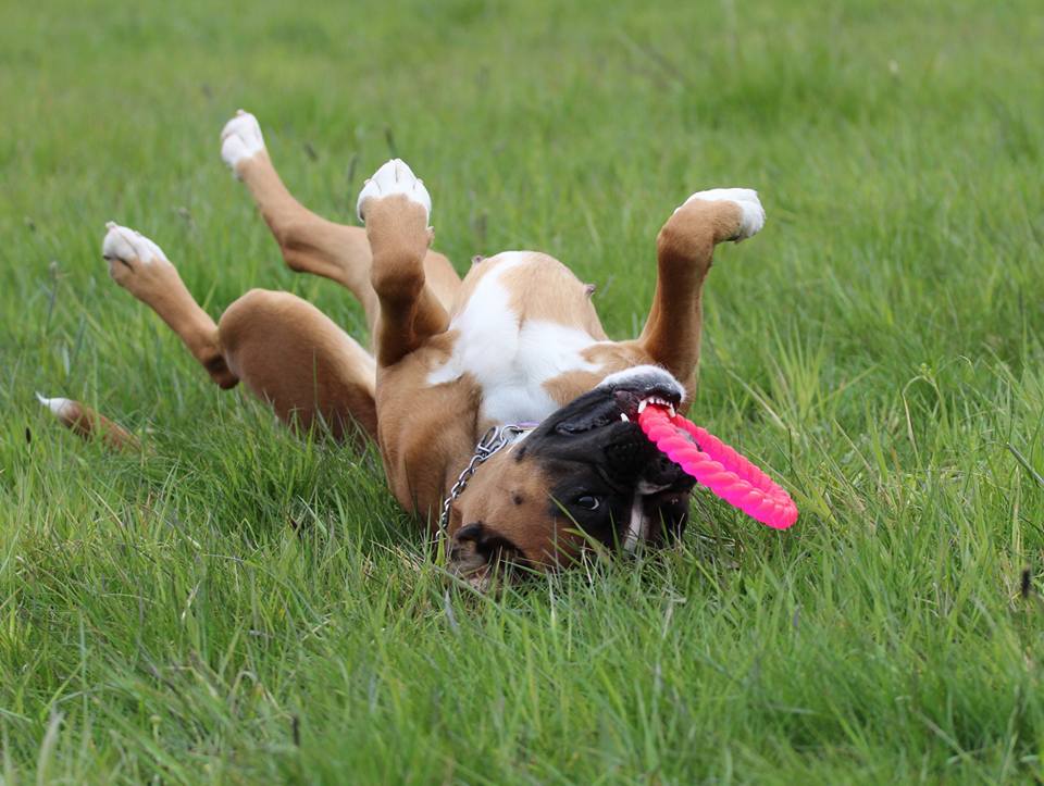 55. den - Zaruška neztrácí optimismus :) po cestě z veteriny si našla novou hračku. Váha 34kg. Celkový nárůst 9kg.