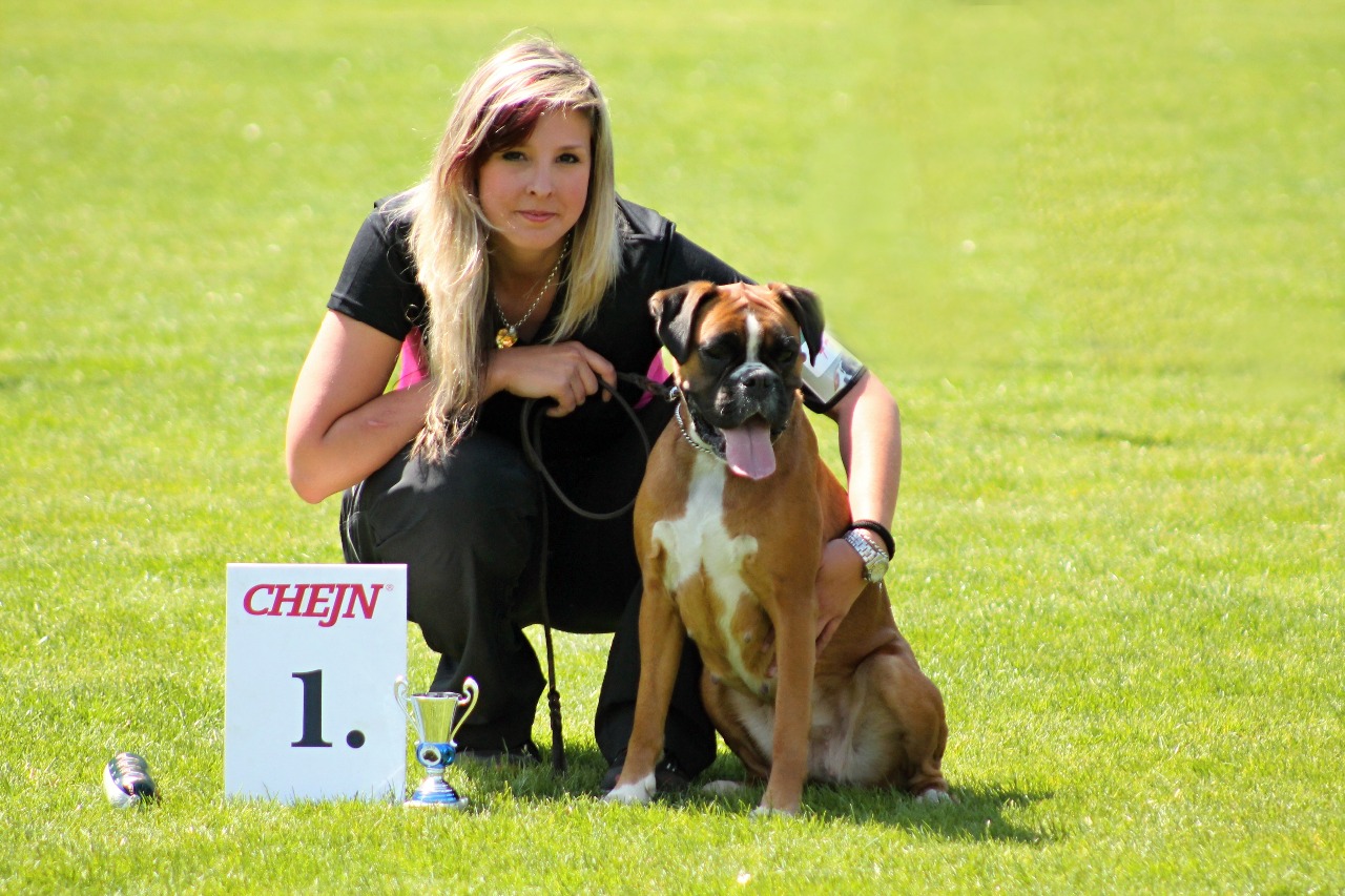 Posudek: 14 měsíců stará, sytě pigmentovaná zlatá fena. Správné výšky a mohutnosti. Téměř kvadratická.